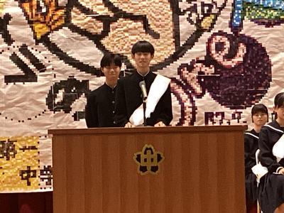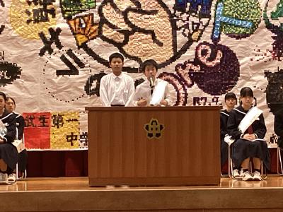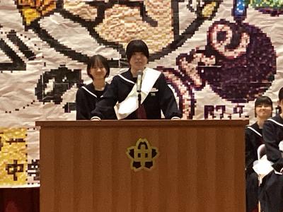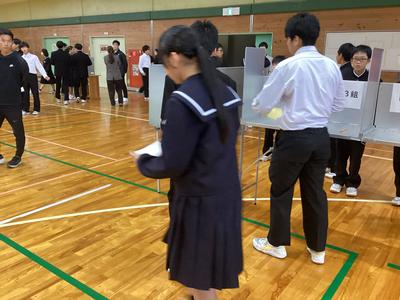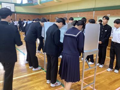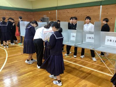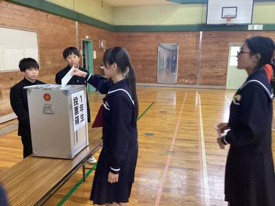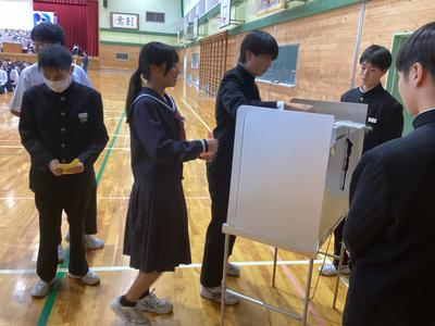 後期生徒会役員選挙の立会演説会と投票が行われました。応援演説者が話をした後に立候補者が公約を含め熱い思いを語りました。その後、生徒一人一人が投票を行いました。