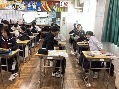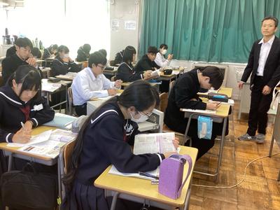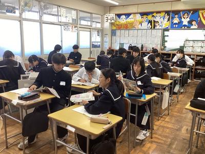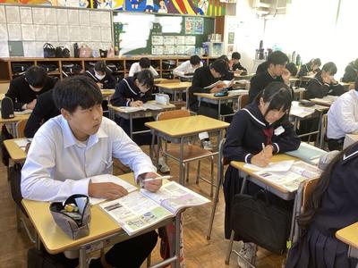 3年1組の社会科の様子です。マスメディアの役割と政治に与える影響について、新聞記事を見比べて考えました。
