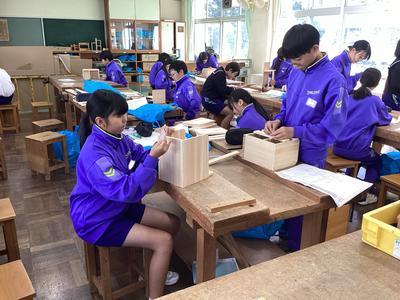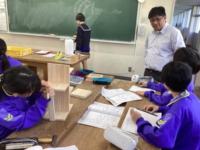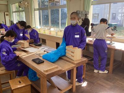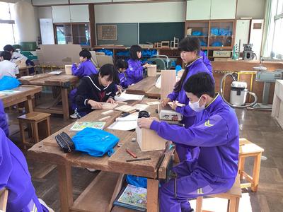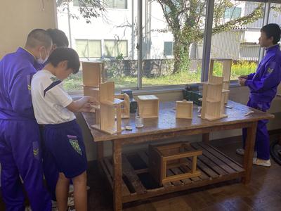 1年2組の技術の様子です。ブックスタンドやコーナーラックなどの作品を製作しました。上手に出来ていました。家で使ってくださいね。