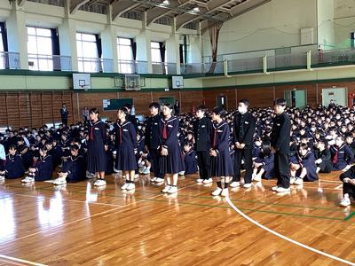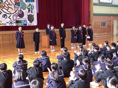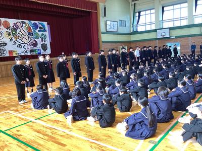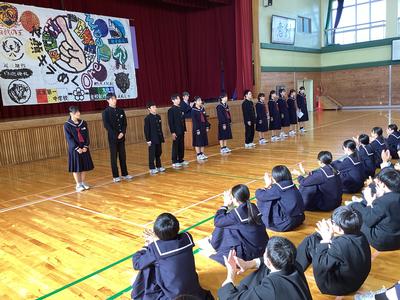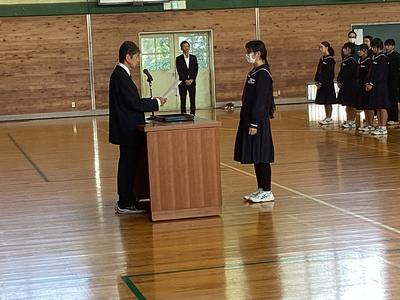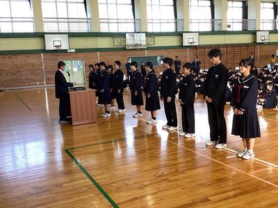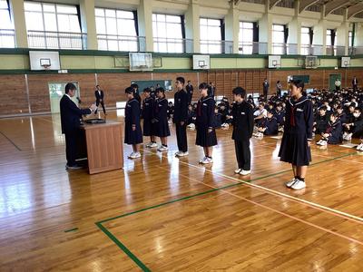 30日(木)に、後期生徒会役員、各部委員会委員長、各学級の級長の認証式を行いました。大きな声で返事をするなど堂々とした立ち振る舞いで、一中をリードしていってくれることを期待させてくれました。後期の一中をよろしくお願いします。