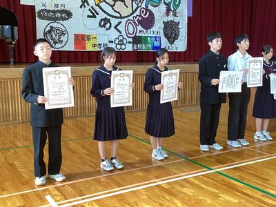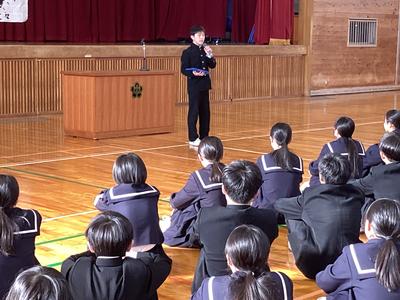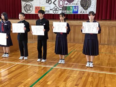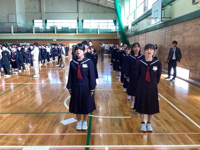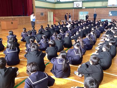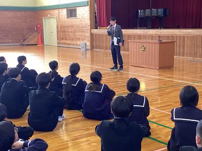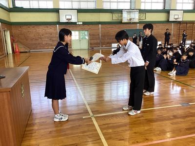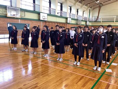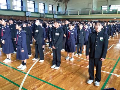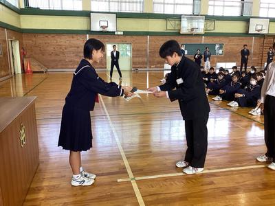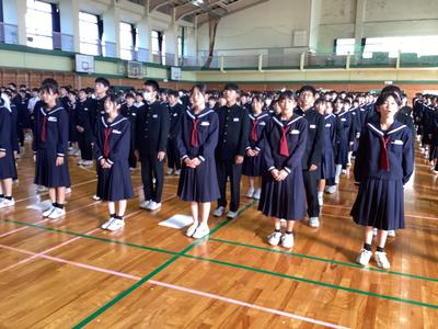 全校集会を行いました。最初に、表彰披露があり、ロボットコンテストや中体連大会、吹奏楽の東日本大会などの表彰が紹介されました。生活委員会が行った「あいさつバトル」の表彰も行われ、生活委員長から「あいさつの大切さ」についての話がありました。その後、校長の話や校歌斉唱があり、前期生徒会長から「ルールを守ること」についての話がありました。生徒からのメッセージは心に響きますね。
