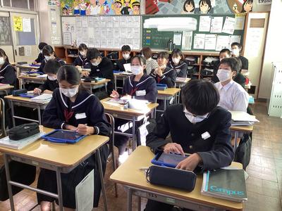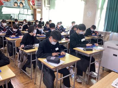 2年6組の数学の様子です。来週の期末テストに向けて、これまでの学習内容の復習をしました。問題の解説を聞きながら、確認ができました。