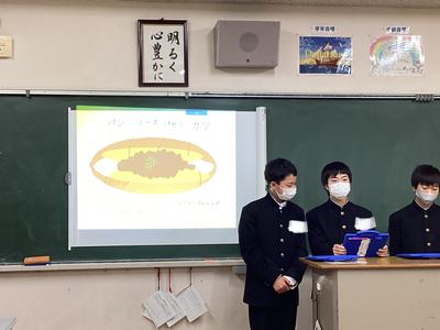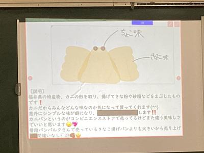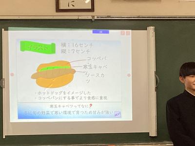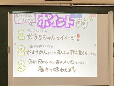 1年1組が創意の時間に商品開発プレゼンテーションを行いました。福井らしさをアピールするさまざまなアイデアを盛り込んだパンが提案されました。協力してくださるのは、武生中央公園近くのパンパルクさんです。試作を重ねて、魅力的なパンが生まれるといいですね。