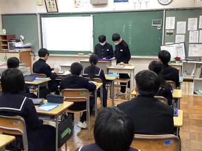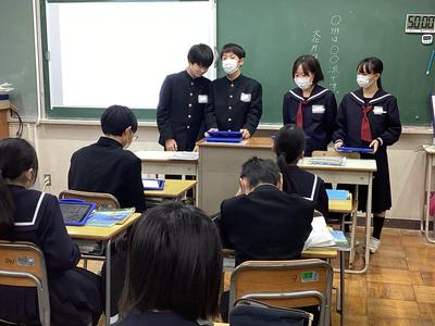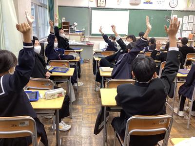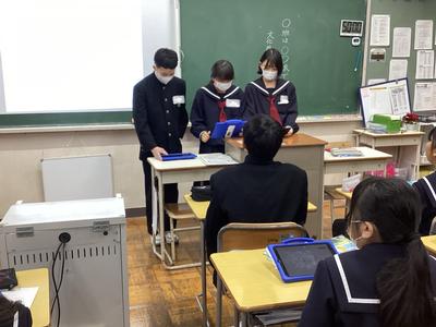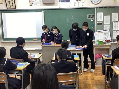 1年2組の国語の様子です。「ニュースの見方を考えよう」という題材の学習をしています。「国語に関する調査結果」をもとにして、言葉の変化を肯定的に捉えるか否定的に捉えるかを班で考えて、ニュースになるようにみんなに伝えました。