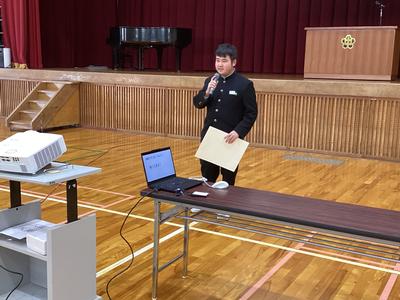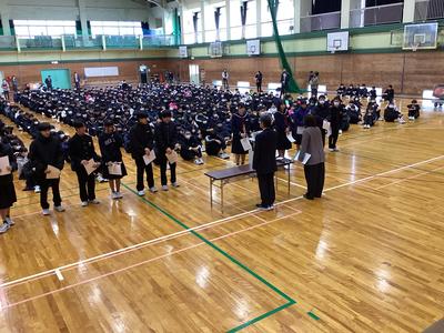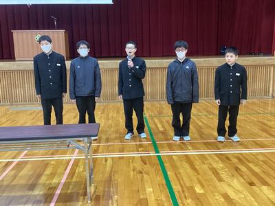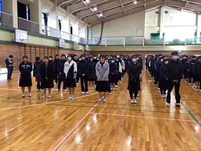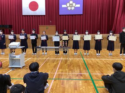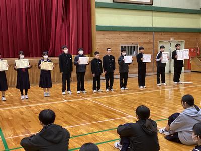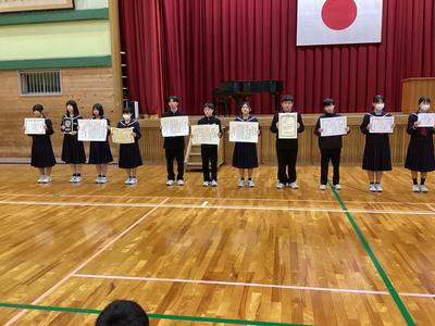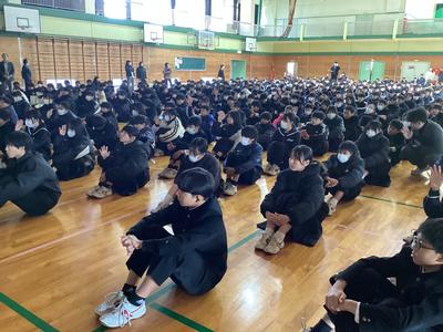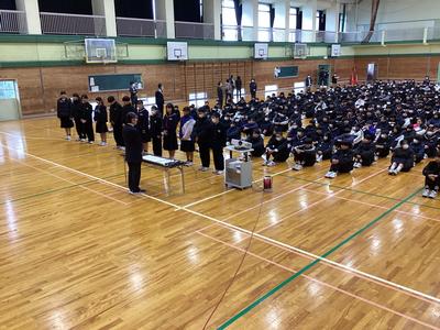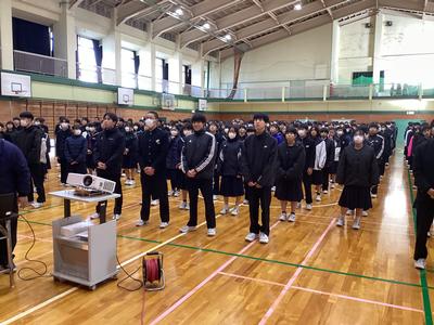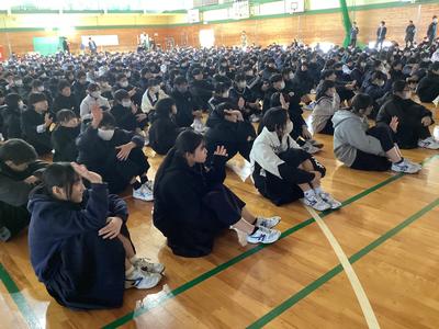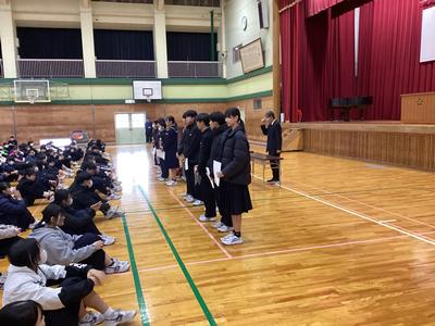 5日(金)に全校集会を行いました。最初に表彰披露と合唱コンクールの表彰を行いました。校長からの話の後に、スクールカウンセラーより「SOSの出し方」についてお話しがありました。最後に、東海北陸大会に出場する科学部とビブリオバトルの全国大会に出場する生徒の紹介がありました。上位大会でも最高のパフォーマンスを発揮してくれることを期待しています。