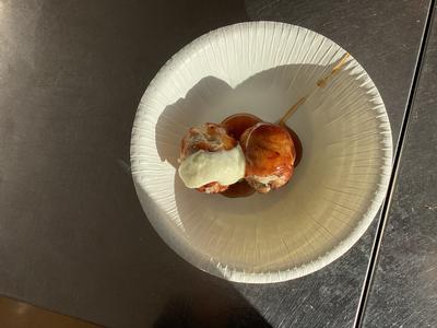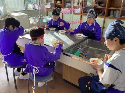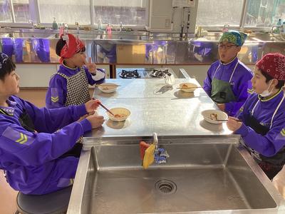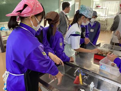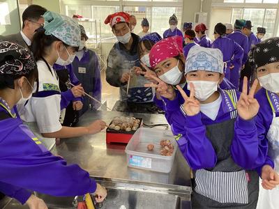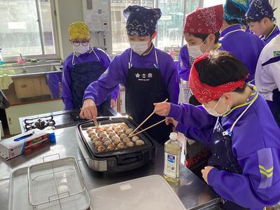 くわばらミートさんと連携してプロジェクトを進めている5組は、1回目の試作と試食を行いました。たこ焼き器を使って焼き上げていきました。熱々で美味しかったですね。この後、どのようにバージョンアップしていくのか楽しみです。