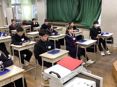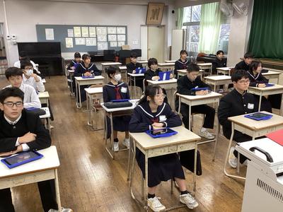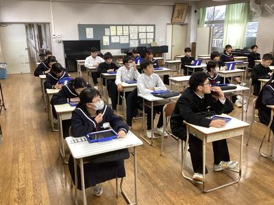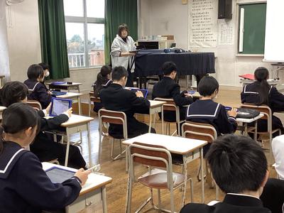 1年4組の音楽の様子です。「魔王」を鑑賞しました。最後の語り手の部分をピアノ伴奏によって想像される登場人物の気持ちや情景を感じとりました。
