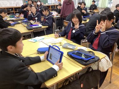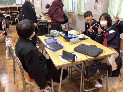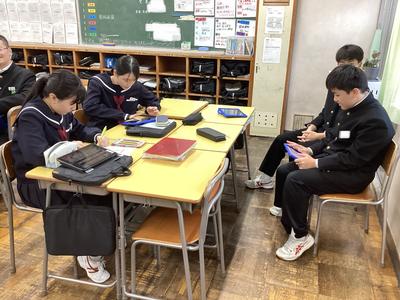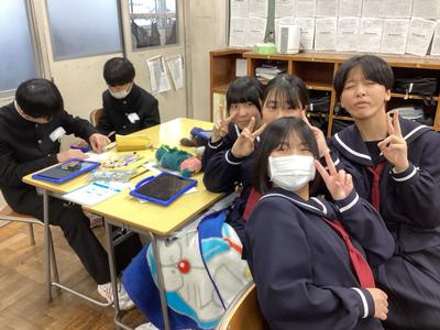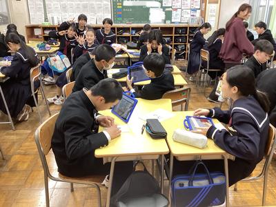 2年3組の創意の様子です。2年生は一中校区や一中のことについて学べるカルタを制作しています。読み札はほぼ完成して、取り札のイラストを描いています。