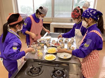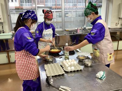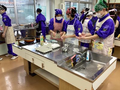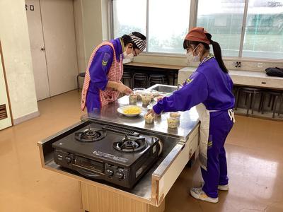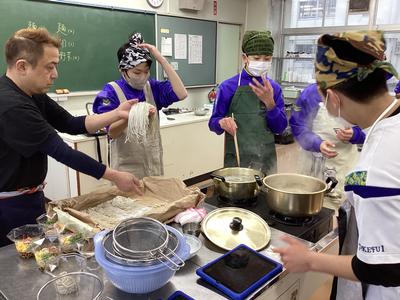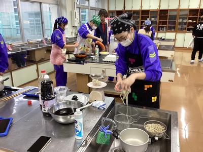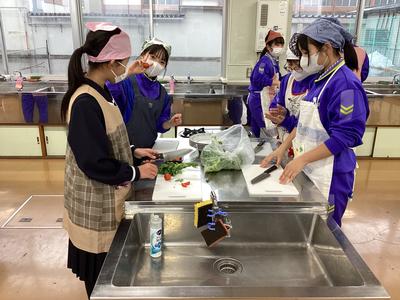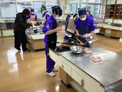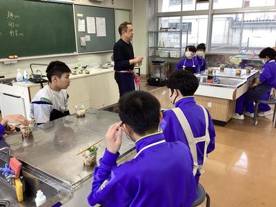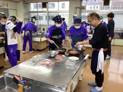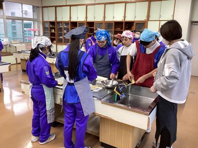 江戸屋さんと連携して商品開発を進めている1年4組の活動の様子です。協力して、調理や盛り付けを行いました。活動後にアドバイスをいただきました。