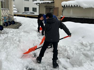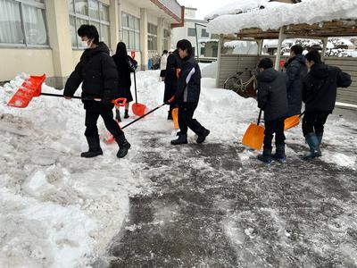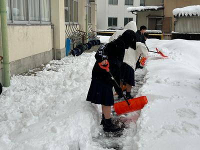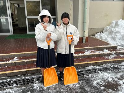 2年1組の生徒が、登校後に生徒玄関付近に積もった雪をどけてくれました。寒い中、協力してくれて、ありがとうございました。
