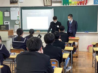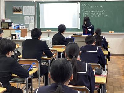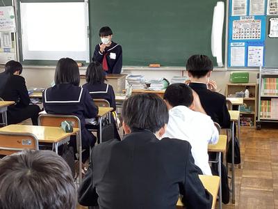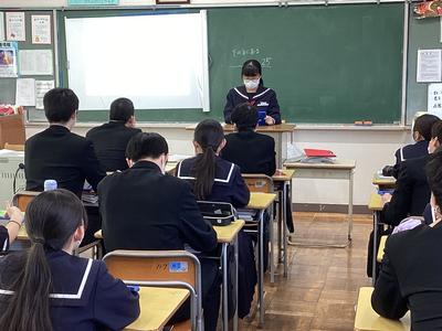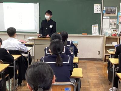 3年生は、創意の時間に探究してきた「越前市への提言」をクラス内で発表しました。まとめたスライドを見せながら、現状や課題等を踏まえ、どのような方策をたてることが望ましいのかを伝えていました。