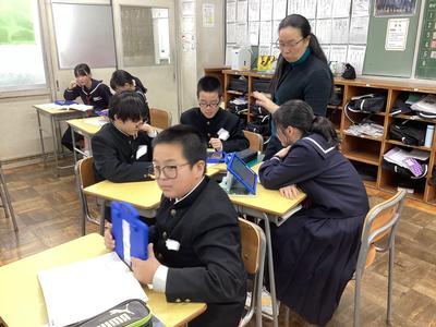 1年5組の国語の様子です。「少年の日の思い出」を読んで、課題に関する描写を書き出し、自分の考えをまとめて、班活動を行いました。