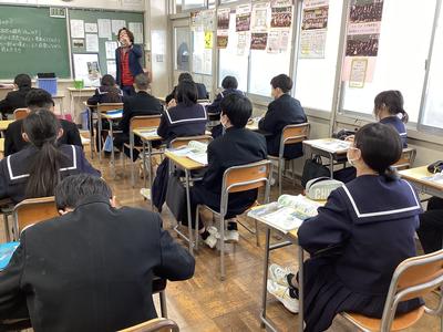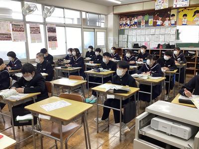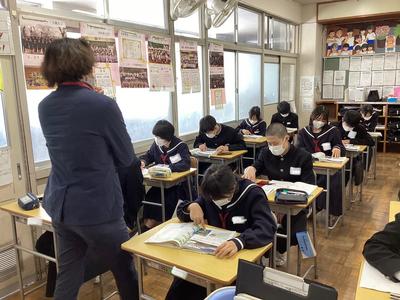 1年2組の理科の様子です。大地の変化について学習しており、火山噴出物についての話を聞きました。