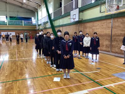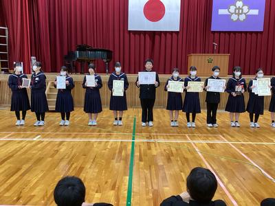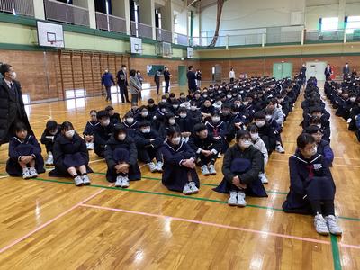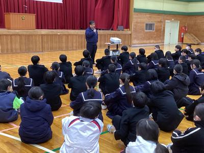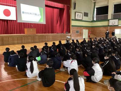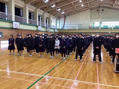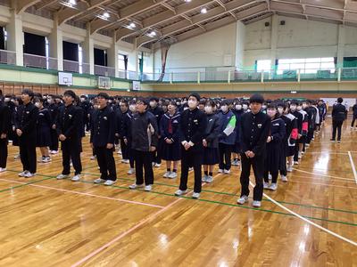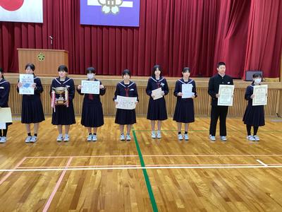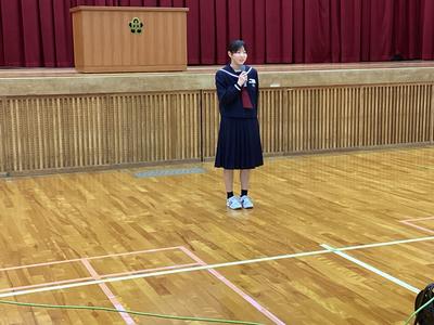 24日(火)に全校集会を行いました。最初に表彰披露を行いました。一年を通じてたくさんの団体・個人が表彰を受けました。おめでとうございます。その後、校長の話があり、ボランティア委員会が活動報告を行いました。最後に、全日本中学生バドミントン選手権大会に福井県代表選手として出場する生徒が意気込みを語ってくれました。なかなか経験できない舞台を楽しんできて下さいね。