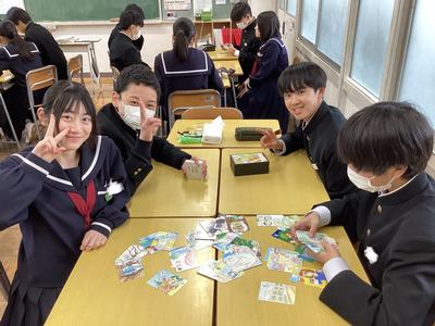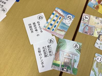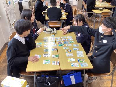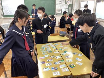 “創意”の時間に取り組んだ一中かるたの製作。印刷を終えて、作品が完成しました。生徒のみなさんは自分たちが作った絵札や取り札を手に取って、満足そうな表情を浮かべていました。この“一中かるた”は校区内の公民館や小学校に配られます。皆さんで楽しみながら、一中のことや地域の歴史•文化を知ってもらえるとうれしいです。