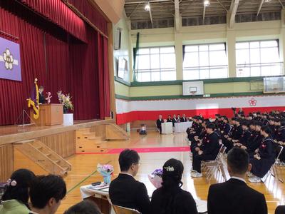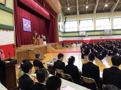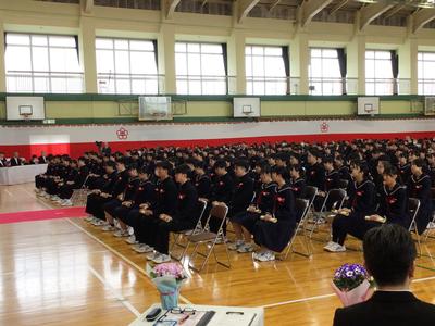 校長がはなむけの言葉を話し、市教育委員会の澤崎教育長からはげましの言葉、教育振興会の有定会長からおいわいの言葉をいただきました。みんな真剣なまなざしで話を聞いていました。
