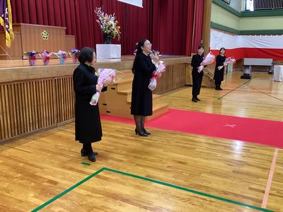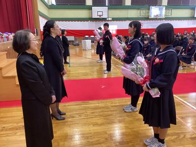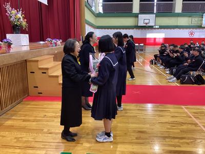 教室で担任との最後の時間を過ごした後、体育館で最後の学年集会が行われました。代表生徒から学年主任や副担任に感謝の言葉が語られました。