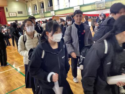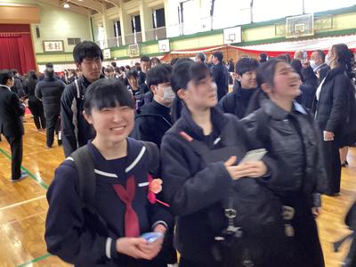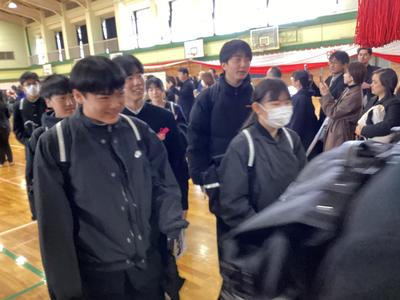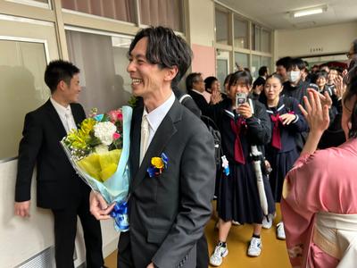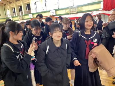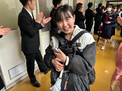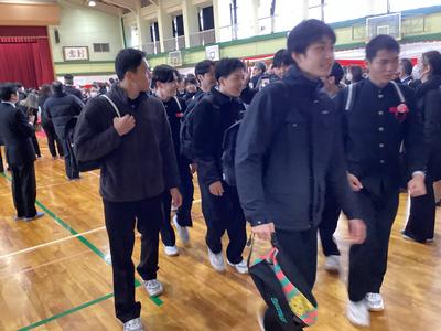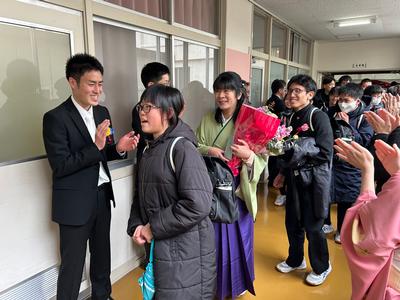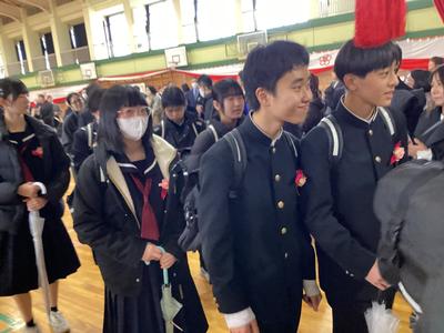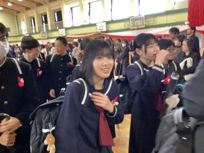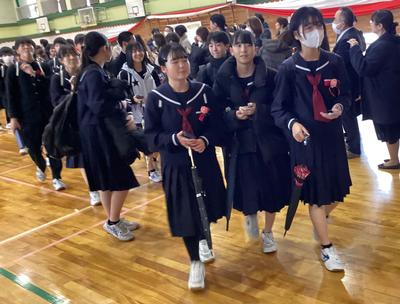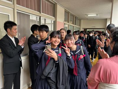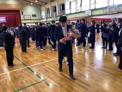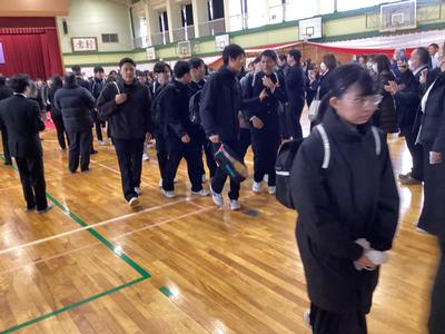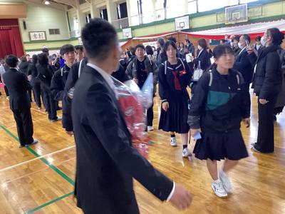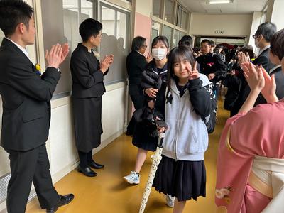 体育館から生徒玄関までの廊下に教職員が並んで、卒業生を見送りました。あちらこちらで感謝の言葉を述べながら歩く卒業生をみました。最後まで優しい生徒たちでした。