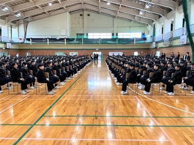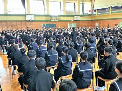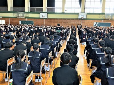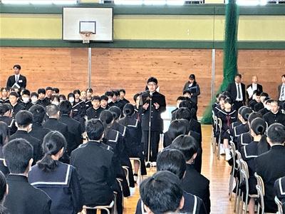 新入生と2・3年生の対面式が行われました。新入生代表の生徒が、2・3年生に向けて入学の誓いを読み上げました。また、2・3年生を代表して、生徒会長から新入生へ歓迎のあいさつがありました。このメンバーで、今日から武生第一中学校の一員として、ともに頑張っていきましょう。