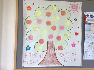 小学生全員から中学生に対する体育大会のお礼のメッセージが届きました。1年生も書いてくれていてとてもかわいいです。中学生は渡り廊下の掲示板の前で、うれしそうに読み合っていました。