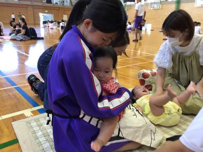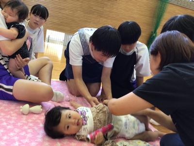 本校の3年生と一緒に、赤ちゃんだっこ体験に参加しました。お母さんに赤ちゃんを抱っこさせてもらったり、いっしょに遊んだりしました。男子生徒は慣れないのか、3人でオムツ替えに悪戦苦闘していました。赤ちゃんの温かさに触れ、気持ちも温かくなり、かわいらしさにすっかり癒されていました。