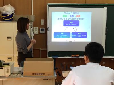 今日は栄養教諭の先生からスポーツと栄養について指導を受けました。部活動の中心となって一生懸命がんばっている2年生には今日の指導を受けて、5つの色の食材をバランスよく取って睡眠を十分にとり、健康な体を作ってほしいと思います。