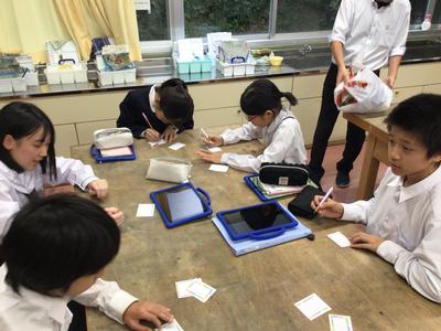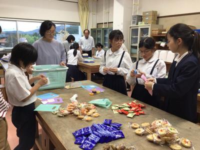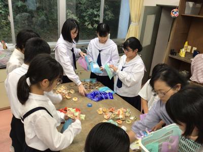 学習発表会は地区敬老会と合同開催です。今日は委員会の時間を使って、敬老会に参加してくださるお年寄りのみなさんに渡すお菓子のプレゼントを作りました。一人一人に手書きのメッセージカードをつけて、当日渡します。みなさんに喜んでもらえるとうれしいです。