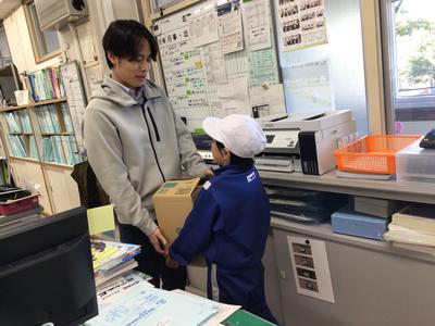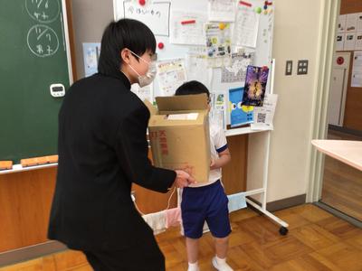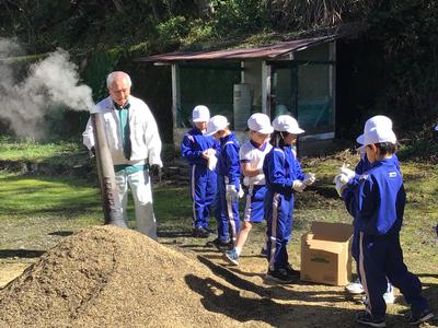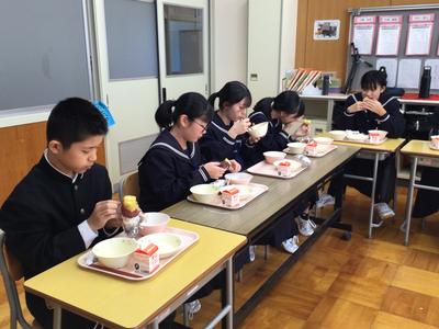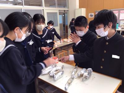 小学1、2年生と用務員さんが、先日小学校の畑でとれたさつまいもを焼きいもにしてくれました。おいしそうに焼けたおいもを1年生が「おいしく焼けたので、ぜひ味わってください」と、中学校校舎まで給食の時間に合わせて持ってきてくれました。籾殻でじっくりと焼いた焼き芋はしっとりとして甘味も十分で、とてもおいしかったです。