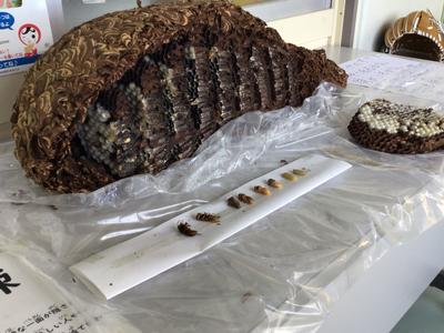 スズメバチの巣の内面をみんなで観察しようと、小学校の教頭先生がきれいに半分に切ってくれました。蜂の成長の様子がわかるように、中から成長の順番に蜂の幼虫を抜き出して展示しています。なかなか見ることができないものを目の前で見ることができて、生徒たちは職員室前を通るたびに立ち止まってじっくりと見ています。