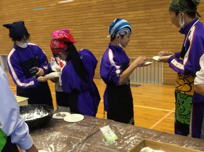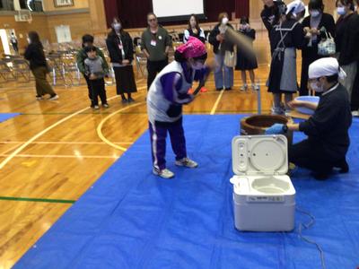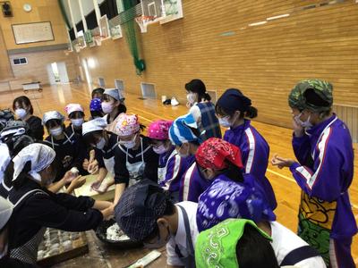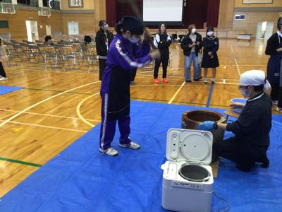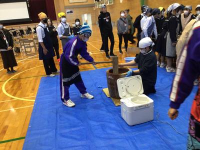 2年生が、本校の2年生と一緒に黒米入りのお餅をつきました。臼と杵でお餅をつくのは小学生以来だったからか、杵がうまく使えない生徒がいました。みんなで餅を丸めた後、つきたてのお餅をいただきました。黒米のつぶつぶ感がおいしいお餅で、1、3年生、先生方にもおすそ分けしました。