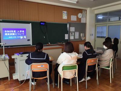 3年生は県立入試まで100日を切りました。今日は進路指導主事の先生から、今後の進路の予定や、入試の概要について説明を受けました。今月末には三者面談も始まります。それぞれが目指す進路の実現に向けて、みんなで一丸となってがんばっていきます。