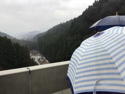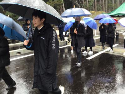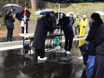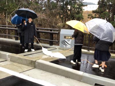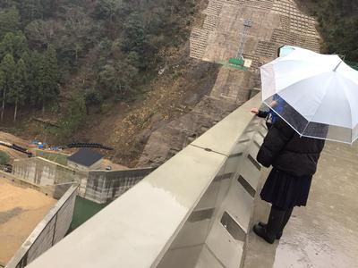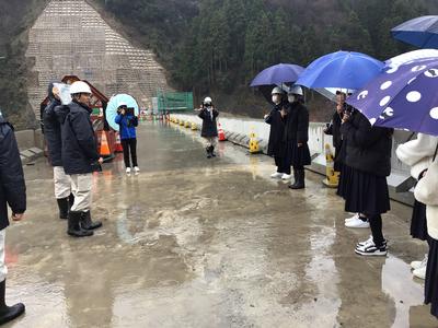 吉野瀬川ダムの建設にあたり、坂口地区に新しい道と橋ができました。その橋の命名を坂口校の生徒がし、名板を分校の生徒が書いたことで、その橋の渡り初め式に分校生が招待されました。はじめに学校でダム建設の詳しい説明を聞き、式に参加した後、みんなでゆっくりと歩いて橋を渡りました。除幕式などをし、とても誇らしい気持ちで式に臨みました。その後、バスで来月水を張る前のダムに行き、現地見学をさせていただきました。雨が降る中でしたが、滅多にできない貴重な体験をすることができ、生徒たちはみんなとてもうれしそうでした。
