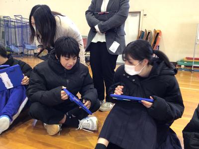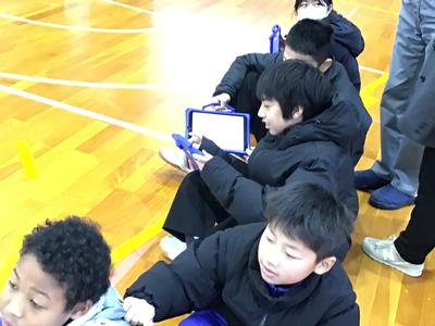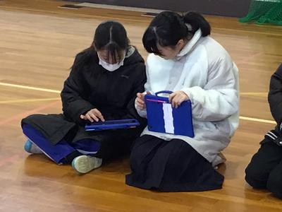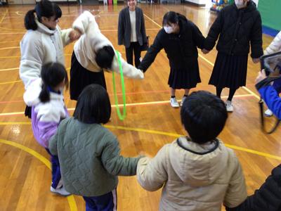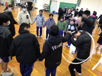 児生会執行部主催のクリスマス集会を4時間目に行いました。フラフープくぐりや絵しりとり、背中に文字を書いて順番に伝えていくゲームを縦割り班でしました。