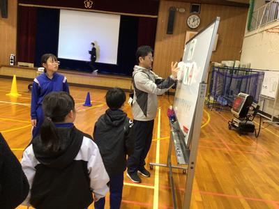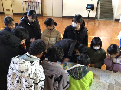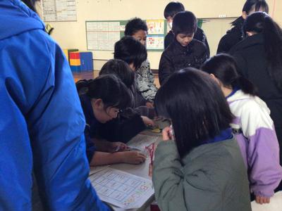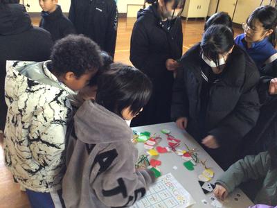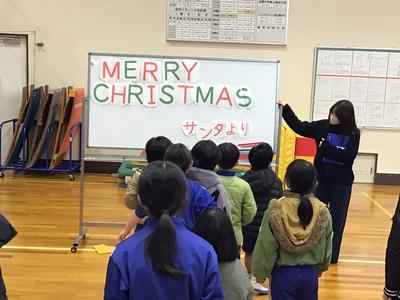 封筒の中身を順番につなげると、Merry Christmas とサンタからのメッセージができあがり、かわいいサンタが出てきました。みんなはサンタとじゃんけんをし、執行部手づくりのしおりとステッカーをもらってうれしそうでした。