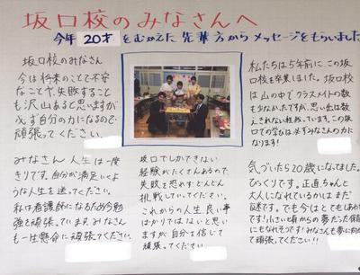 5年前の卒業生が、思い出深い学校で20歳のつどいを行いました。当時お世話になった先生方も来校し、彼らの成長を祝ってくれました。小中学校時代の懐かしい話は途切れることなく、大変盛り上がりました。卒業生たちはそれぞれ自分の道を着々と進んでおり、立派に成長した姿を見て、みんなとても幸せな気持ちになりました。卒業生たちは坂口校のみんなにメッセージも残してくれました。現在、分校の掲示板に貼ってあります。ご来校の際にぜひご覧になってください。