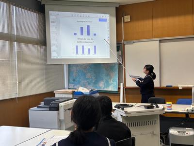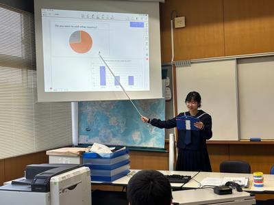 英語の授業で、自分でテーマを決めて調査し、その結果を英語で報告するプレゼンテーションを行いました。テーマは「外国に行くならば、どの国に」「好きな動物」「好きな教科」などさまざまでした。生徒たちはExcelでグラフを作り、そのグラフを見せながら、調査結果の報告と分析、自分の意見を話しました。それぞれが聞き応えのあるおもしろい発表でした。
