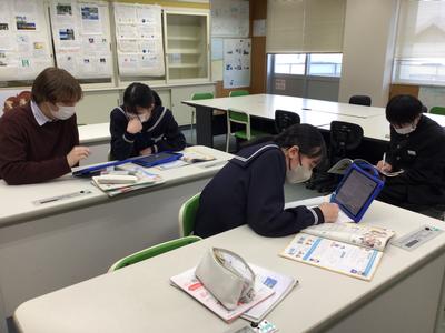 3年生の英語の授業で、「日本は住むのによい国か」をテーマにディベートを行いました。3人しかいないので、ジャッジにALTの先生に一緒に入っていただきました。反論の時間には、相手の意見に対して的確な質問をし、その答えに対してさらに質問をするという場面が見られました。ジャッジも難しくて、ALTの先生とかなり話し合っていました。緊張していたのか、すごく考えたからか、授業後はとても疲れた表情をしていました。次回の授業も別のテーマでディベートをします。
