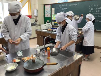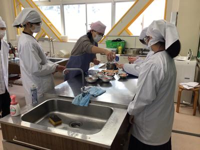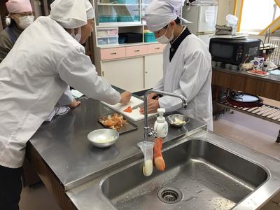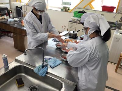今日はお肉料理でハンバーグとスープを作りました。ちょうど玉ねぎのみじん切りをしていましたが、みんな大変上手に切っていました。スープの具材の野菜もきれいにいちょう切りにしていました。