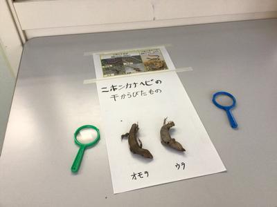先日、止水溝の中でカナヘビのきれいなミイラを見つけました。偶然同じミイラを2匹見つけ、しっぽは切れているのですが珍しいのでみんなに見せようと小学校の教頭先生が資料とともに職員室前で展示してくれています。生徒たちは気持ち悪いと言いながらも、なぜか何度も見ています。しかし、虫眼鏡を手に取る生徒はなかなかいません。