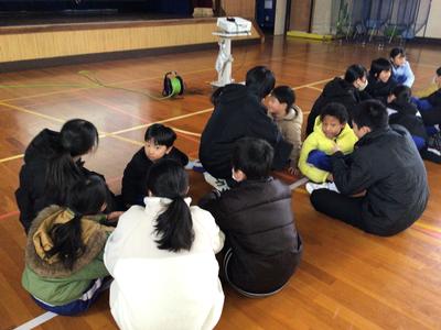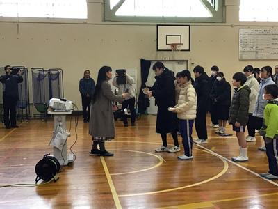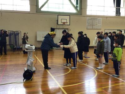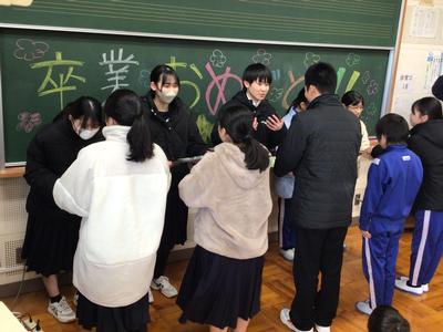 4時間目に卒業生を送る会を行いました。最初に、地区環境部会から卒業、進級を祝う祝い餅と、振興会から先日の「ふるさとを思い、支え合うつどい」に作品を出品したお礼で図書券をいただきました。