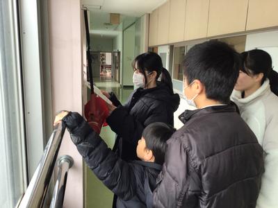 音楽室に集まったみんなで卒業生に全校で作った色紙をプレゼントしました。お世話になった先生方からのビデオを見て、最後に花道を作って送りました。