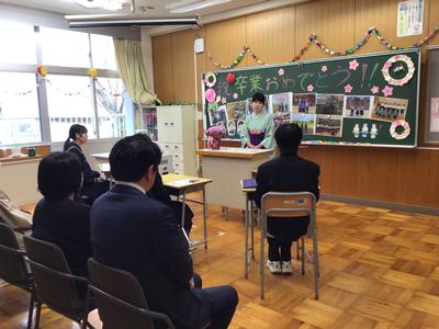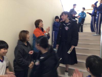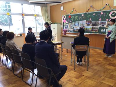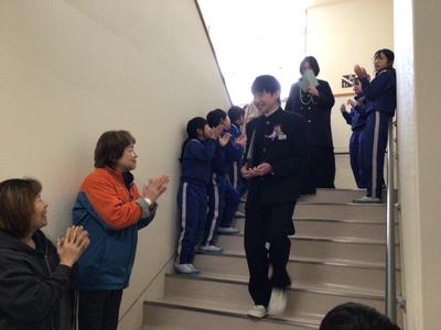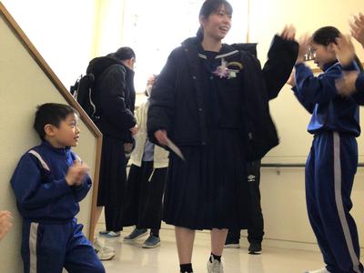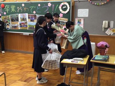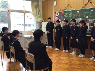 本校から分校に戻り、最後の学活をしました。先生方、在校生が卒業生に向けて、また卒業生が在校生や先生方に向けて激励の言葉や感謝の言葉、プレゼントのメッセージを送りました。涙あふれる温かい時間でした。最後は小学校の皆さんも含めて坂口校みんなで見送りました。卒業生の新たなステージでの活躍を期待しています。