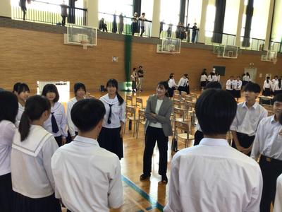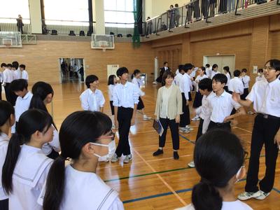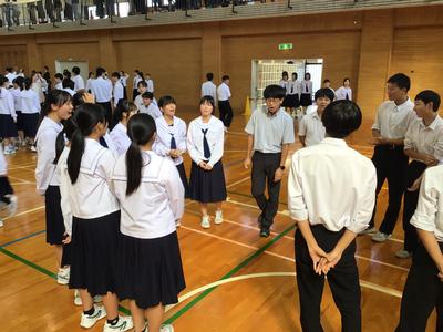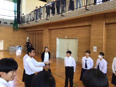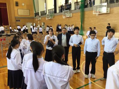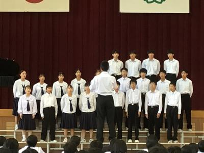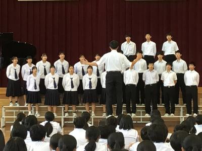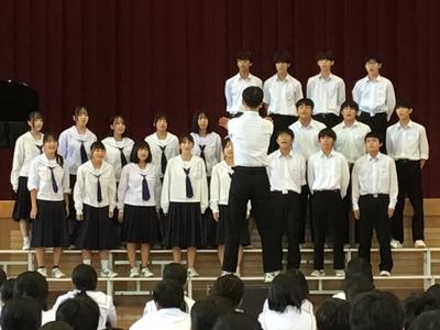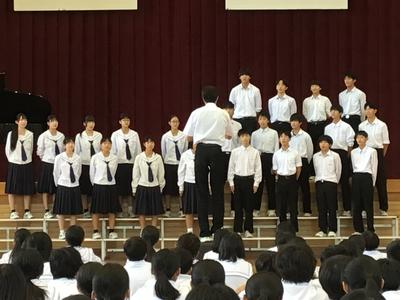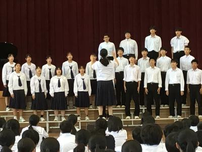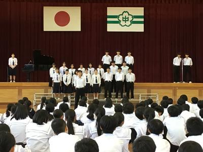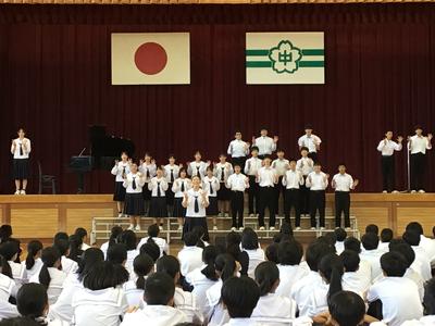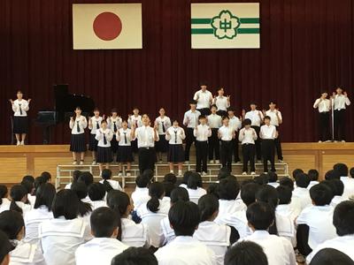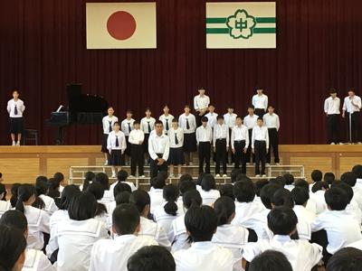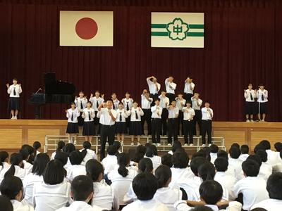 3年生の部です。3組「手紙」、2組「予感」、1組「ヒカリ」、5組「十字架の島」、4組「YELL」です。