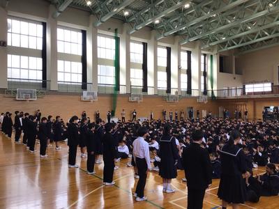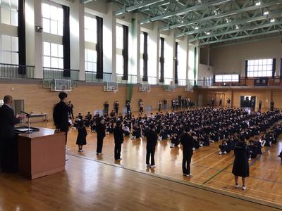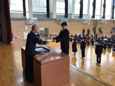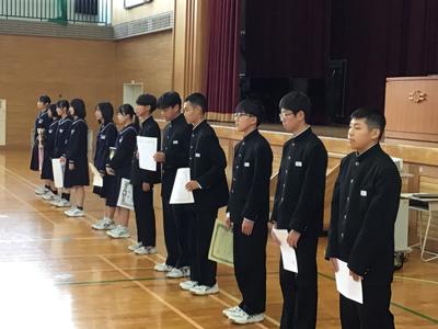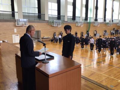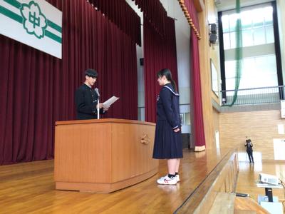 後期の級長、生徒会長、生徒会執行部、各自委員会の委員長の認証式を行いました。名前を呼ばれた時の返事が素晴らしく、自覚と責任を持って頑張ろうとする意欲が感じられました。