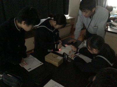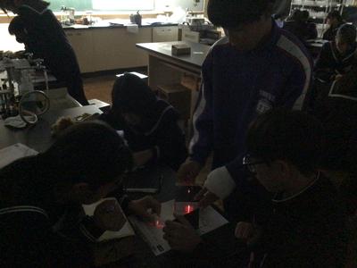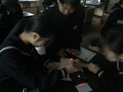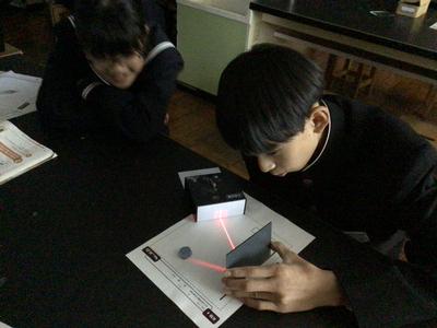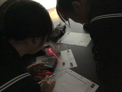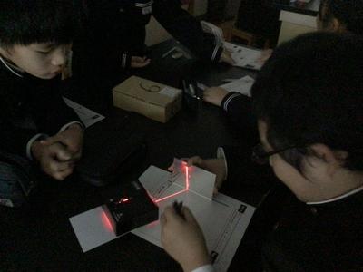 光を鏡に当てて反射する道筋の上に線を引き、当てた光の道筋と反射した光の道筋の関係を調べていました。