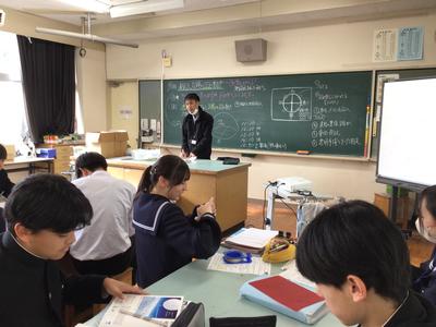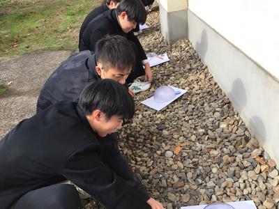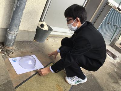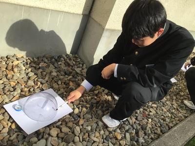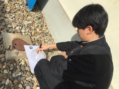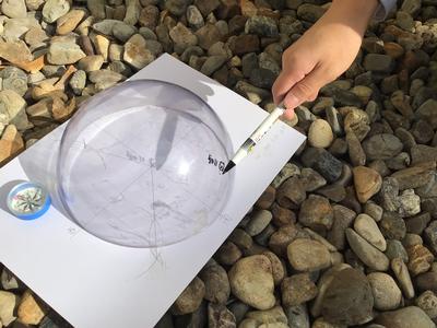 太陽は動きません(動いて見える)が、太陽の1日の動きを透明半球を使って調べていました。