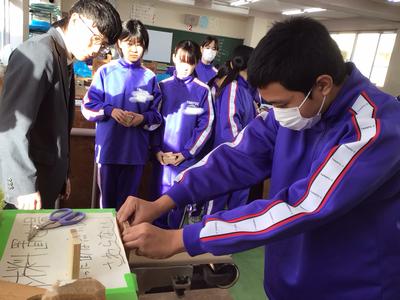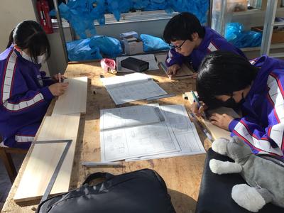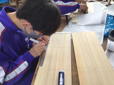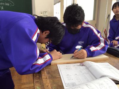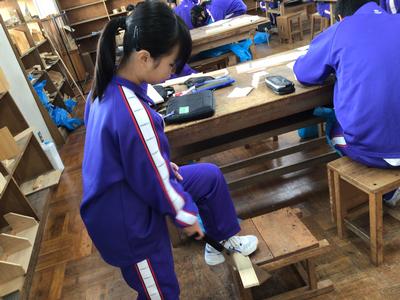 生活に役立つものを作っています。けがき作業をしている生徒、ノコギリを使っている生徒、ベルトサンダーを使っている生徒、進度は様々です。