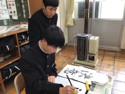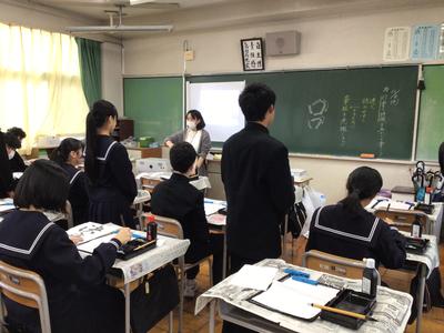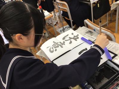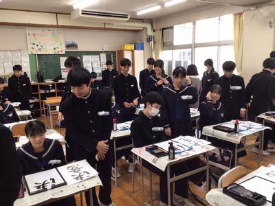 行書の特徴を生かして書こうという課題で学習しました。それができていたかどうかを、お互いに見合っていました。