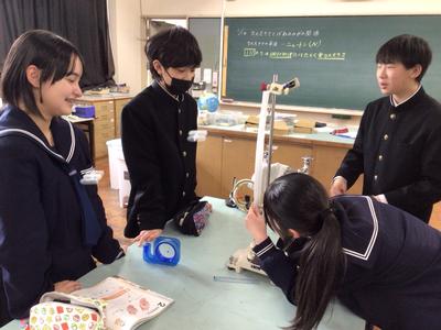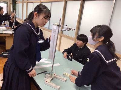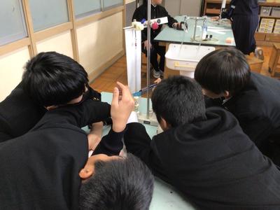 力の大きさとばねののびの関係を調べる実験をしていました。力の大きさの単位のN(ニュートン)についても学習しました。
