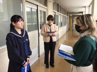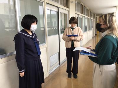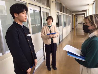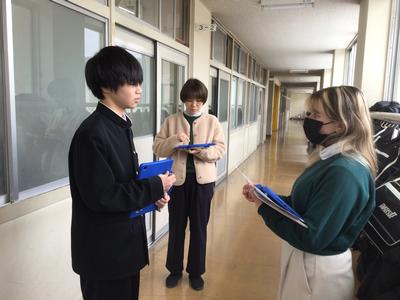 インタビューテストをしていました。中学校生活で一番思い出に残ったことを話していました。